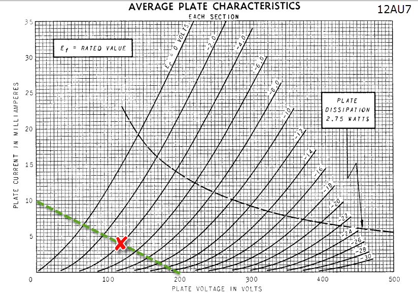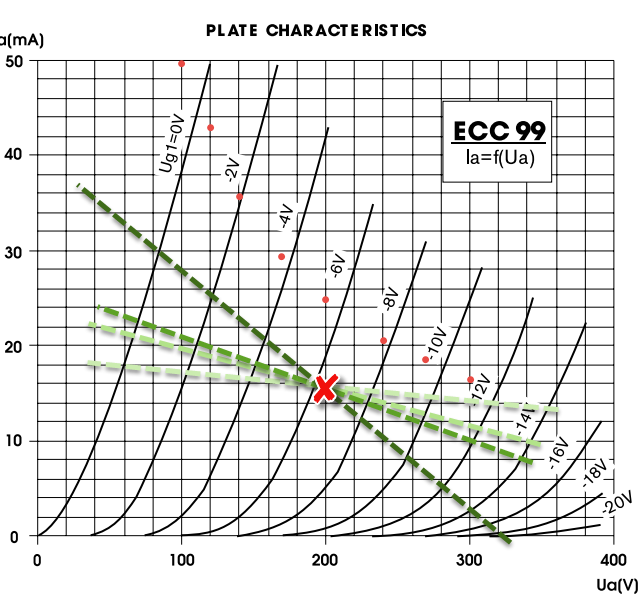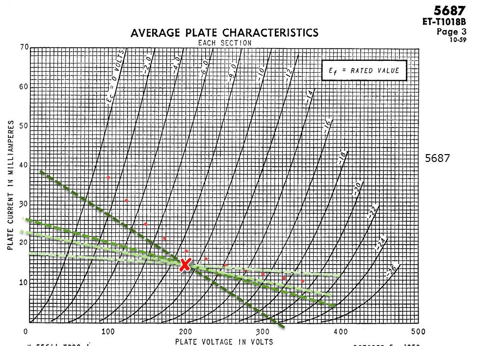 We can see from the loadlines that the tubes are biased at 12.5mA (5687) or 17.5mA (ECC99). That’s a total current through each channel’s CCS of 25mA (50 ohm resistor) or 35mA (35 ohm resistor), respectively. Because our output transformer determines the load, our B+ determines the anode voltage, and the CCS determines the current, our bias voltage is already set between about 7V and 9V, depending on the tube we use.