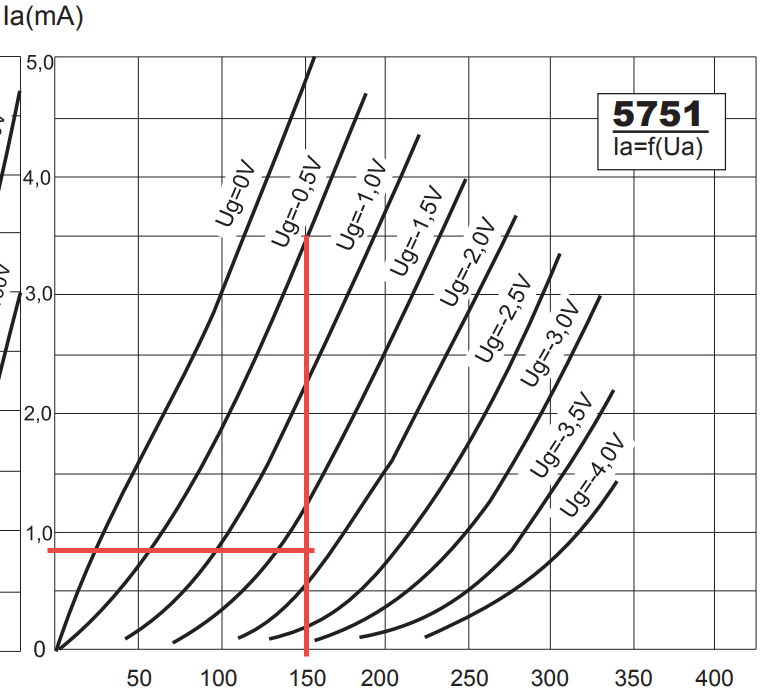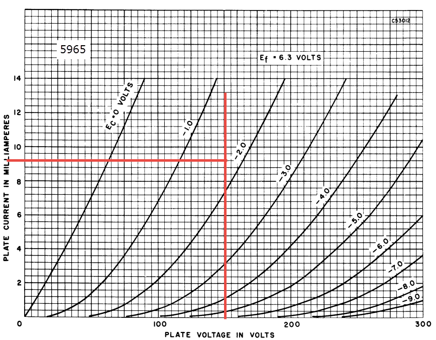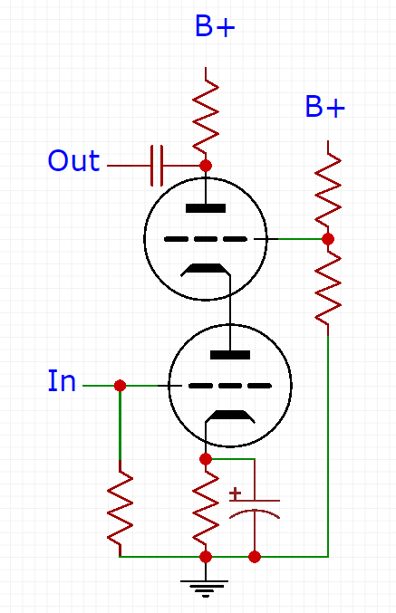 Using an active device, we can alternatively set the anode voltage of a tube and allow the current to vary. The lower tube in a cascode is one such example. In this case, our loadline is vertical rather than horizontal. The tube varies its current with AC signals and this current variation is transformed into a voltage variation across a load resistor (at the “top” of the cascode). The transconductance of the tube and the size of the load resistor determine how much voltage gain is produced; this gain can easily exceed the Mu of the tube.